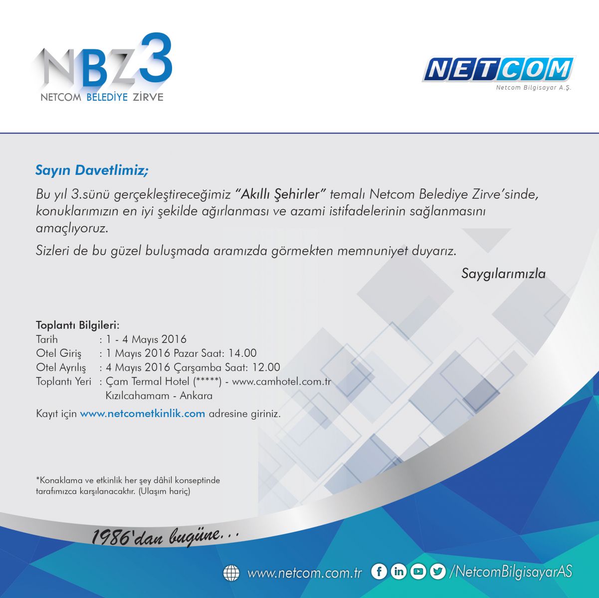 1 – 4 Mayıs 2016 tarihleri arasında Kızılcahamam – Ankara Çam Termal Hotel (*****) de gerçekleştireceğimiz Netcom Belediye Zirve’3 etkinliği hakkında detaylı bilgi aşağıda yer almaktadır.